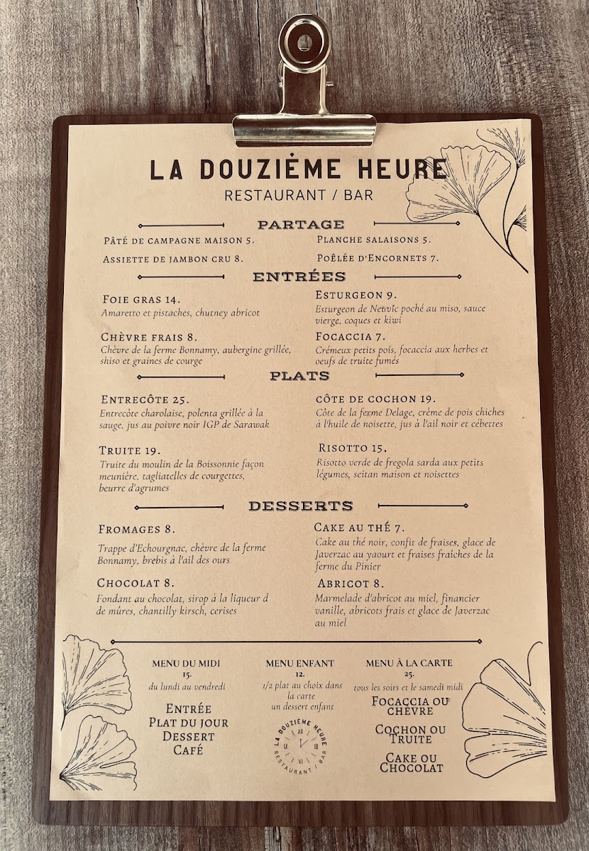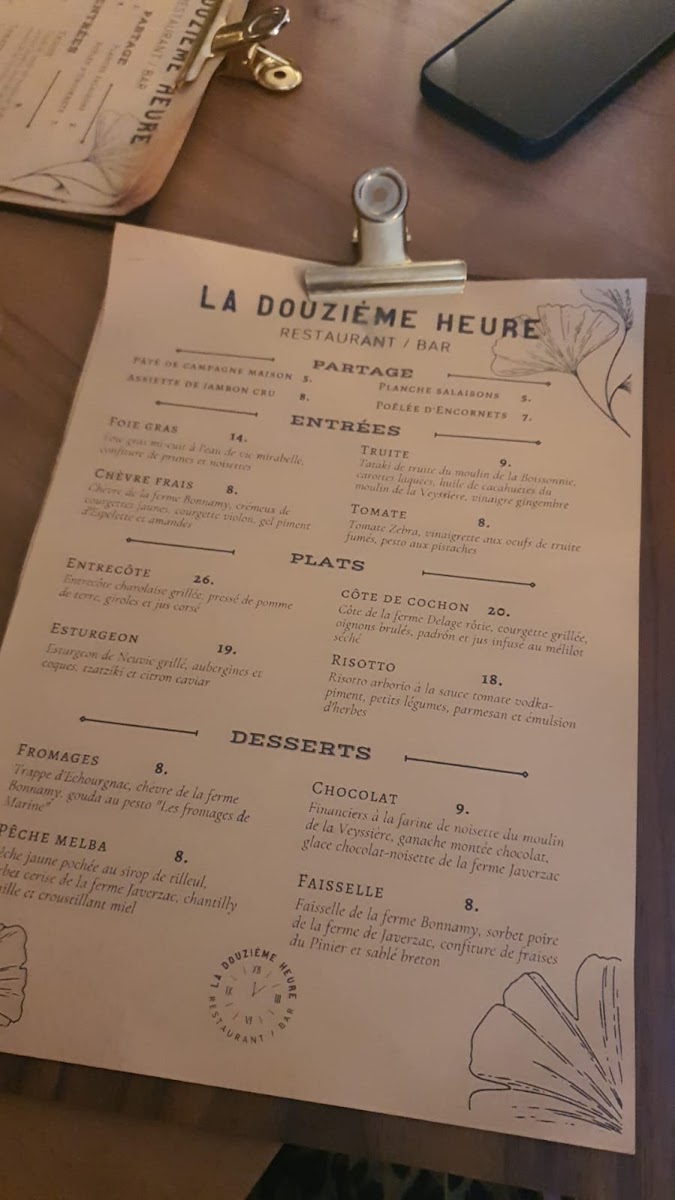 Welcome to La Douzieme Heure, a charming culinary gem nestled in the quaint village of Douzillac, France. This delightful restaurant offers a carefully curated menu that reflects the essence of French cuisine with modern twists. With a focus on quality over quantity, the menu features a selection of just four starters, four main courses, and four desserts, ensuring an exquisite dining experience.